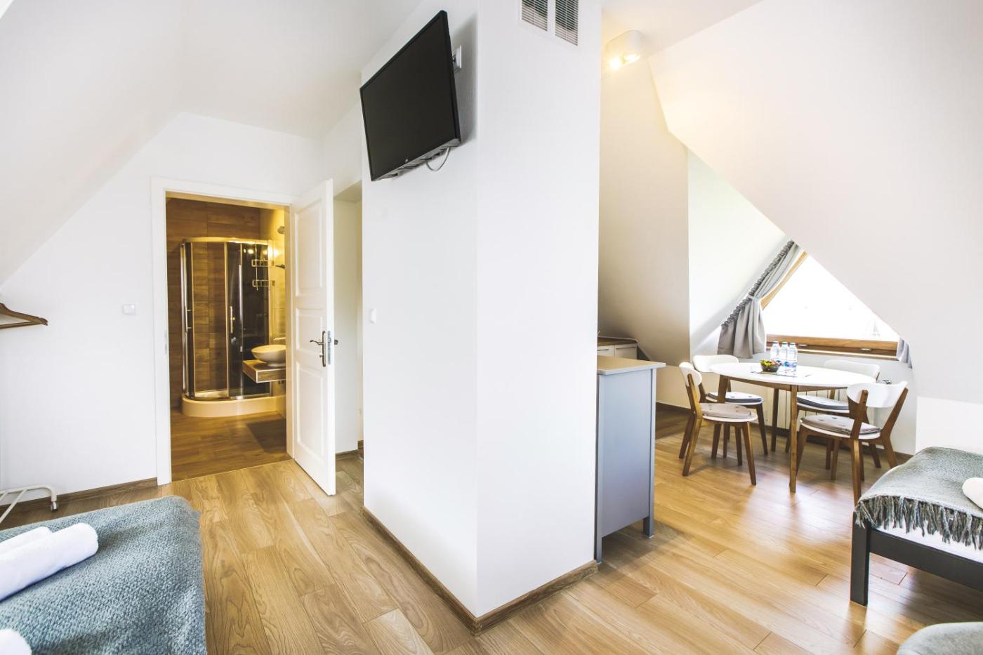 Apartament z 2 sypialniami. This apartment features 2 bedrooms, a kitchenette and 1 bathroom with a shower and a hairdryer. Guests can make meals in the kitchenette that features a stovetop, a refrigerator, kitchenware and a tea and coffee maker. This apartment has heating, flat-screen TV, mountain views, as well as chocolate for guests. The unit has 3 beds. Apartament - 4 osobowy. Powierzchnia pokoju ok.: 48 mkw. ;